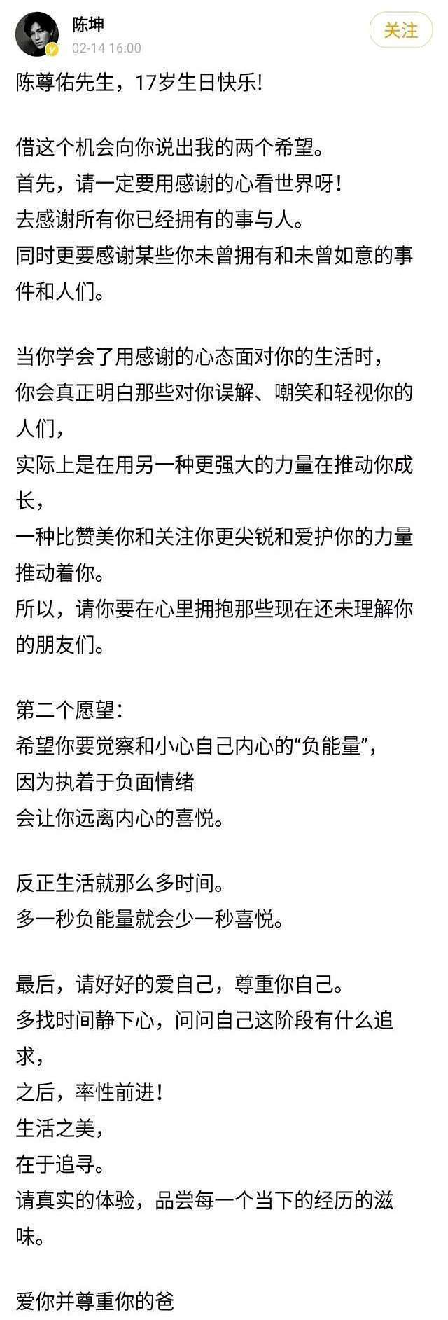陈坤对女儿的讲授,那是真上心。凌晨发文庆生,那字里行间都是对女儿的爱。教女儿“用感谢的心看寰球”,教女儿“觉察和小心我方内心的负能量”,这当爹的,真的操碎了心。